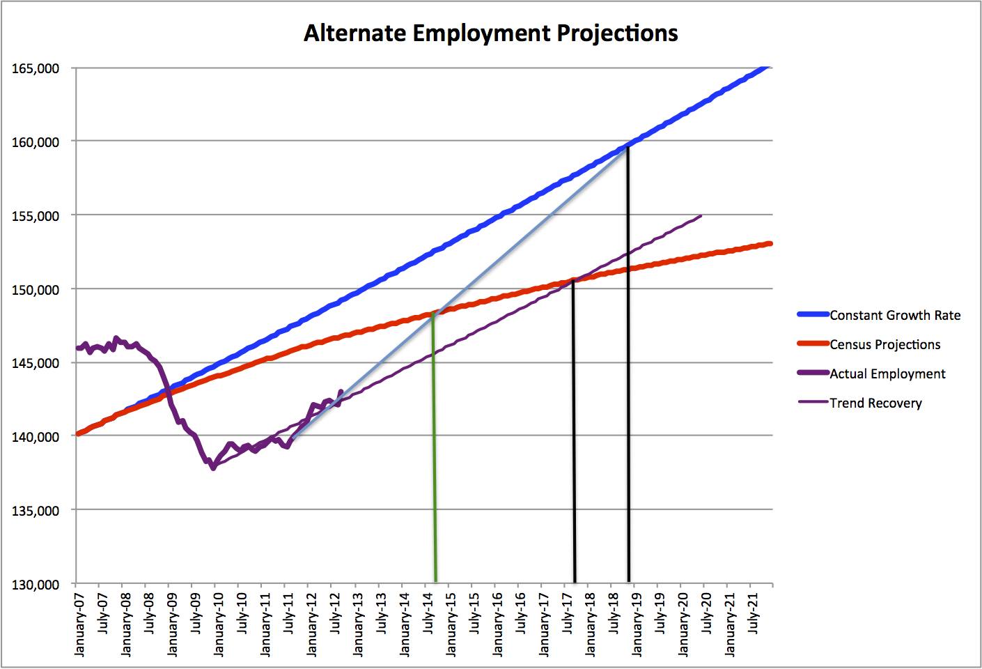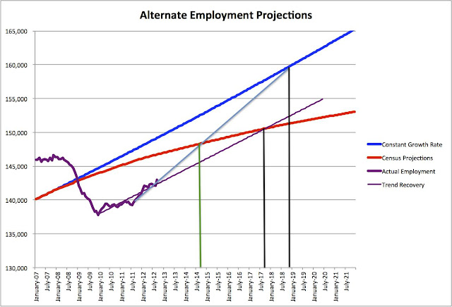 Presumably sometime soon we’ll get projections based on the 2010 Census, but fertility rates change slowly, and even if the 2010 data are off, that will make a difference in the 16-19 age bracket only from 2026. Likewise, mortality was already very low in the age 60 bracket; the Census Bureau projects a continued drop in mortality, and that rate also changes slowly. So going out a decade won’t lead to much error there, either, and its impact is further reduced because employment rates drop. The weakest part of the projection is immigration. Since that presumably has fallen with our Great Recession, it means that if there’s an error, it’s towards an overestimate of the population and hence of the number of jobs our economy needs to create.
