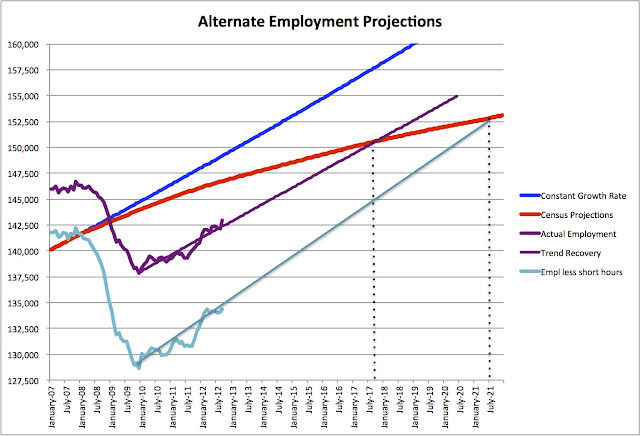 So first I calculated the expected normal level of employment, correcting for demographics; details are below the chart. I then calculated trend job growth (a simple regression using data from January 2010, the rough nadir of the recession, through Sept 2012). On that basis we return to normal levels of employment in fall 2018. If we naively take the faster average growth since summer 2011 (the light blue in the graph), we recover in time for the next midterm elections. That’s a sharp contrast to the naive straight-line projection of required employment growth, which doesn’t get us back on track until far into the future or (under the optimistic light blue scenario) late 2018.
