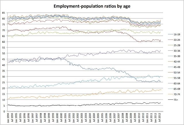 A bit of tedium on my calculations. I began by pulling employment to population data from the Bureau of Labor Statistics, a bit tedious as you have to pull a lot of data series, and the series include 13 observations per year because they include an annual number. So I had to delete those. (Thank you Nisus Writer, for making that easy!) Then I graphed it in Excel to see if the data suggested shortcuts.