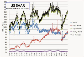 The US recovery continues at a snail’s pace; the auto industry is doing better. The rise in the SAAR [seasonally adjusted annual rate of sales] puts us below the bubble-inflated peak of 2005-6, but given subsequent population growth is at a more sustainable level. Other auto-related indicators show marked improvement, but suggest we still have a ways to go. First, the share of the auto industry (retail and manufacturing) was at 2.3% of the labor force in the late 1990s; it then fell steadily to 2.0% before falling off a cliff in 2008. The nadir was 1.6%; today we’re back to 1.8%. That is only about halfway, assuming that other structural changes in the US (the continued growth of healthcare) makes it possible to return to the days of yore.